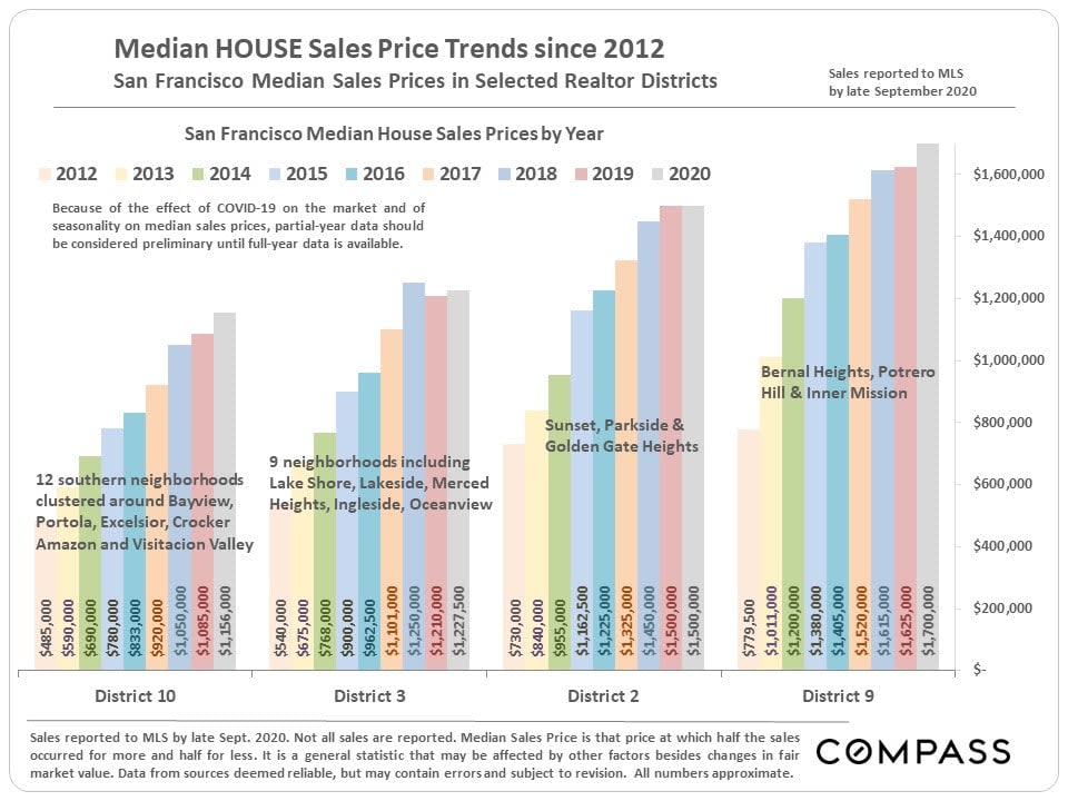 The 3 charts below are focused on the districts in which the greatest number of house or condo sales occur. The first 2 refer to house sales and the third to condo sales.