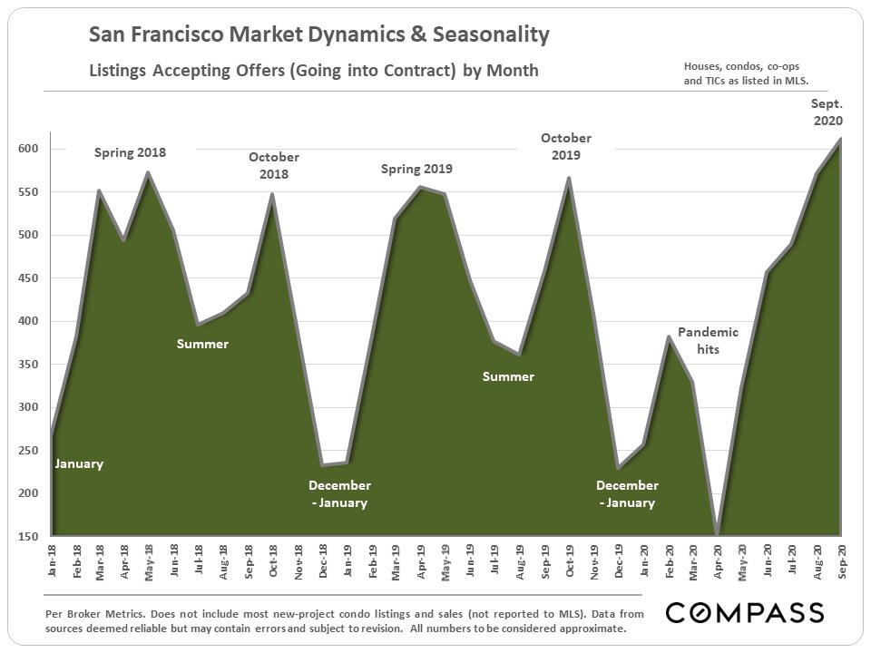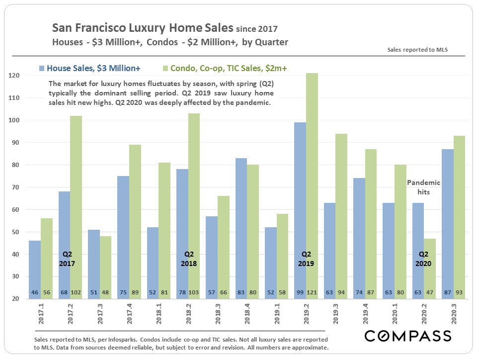 Q2 is typically the strongest selling season for luxury homes, but the pandemic changed that dynamic in 2020. Though the SF luxury segment recovered in Q3, in many other counties around the Bay, luxury home sales have soared to all-time highs.