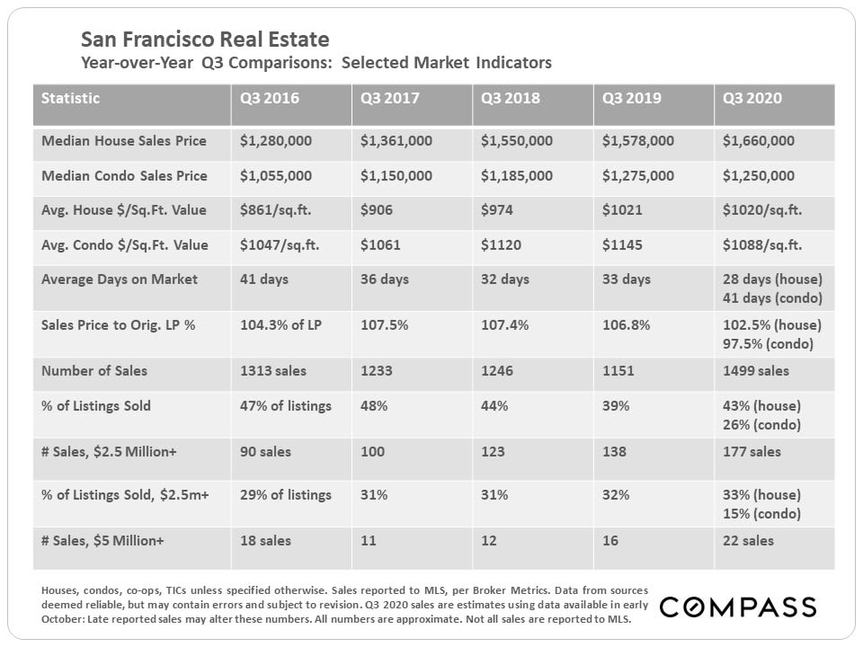 The table below compares Q3 statistics across 5 years. Since the dynamics of the SF house and condo markets have significantly diverged since the pandemic struck - the condo market has been weaker - we broke some of the 2020 stats out separately in the table, and then in some of the charts following.
