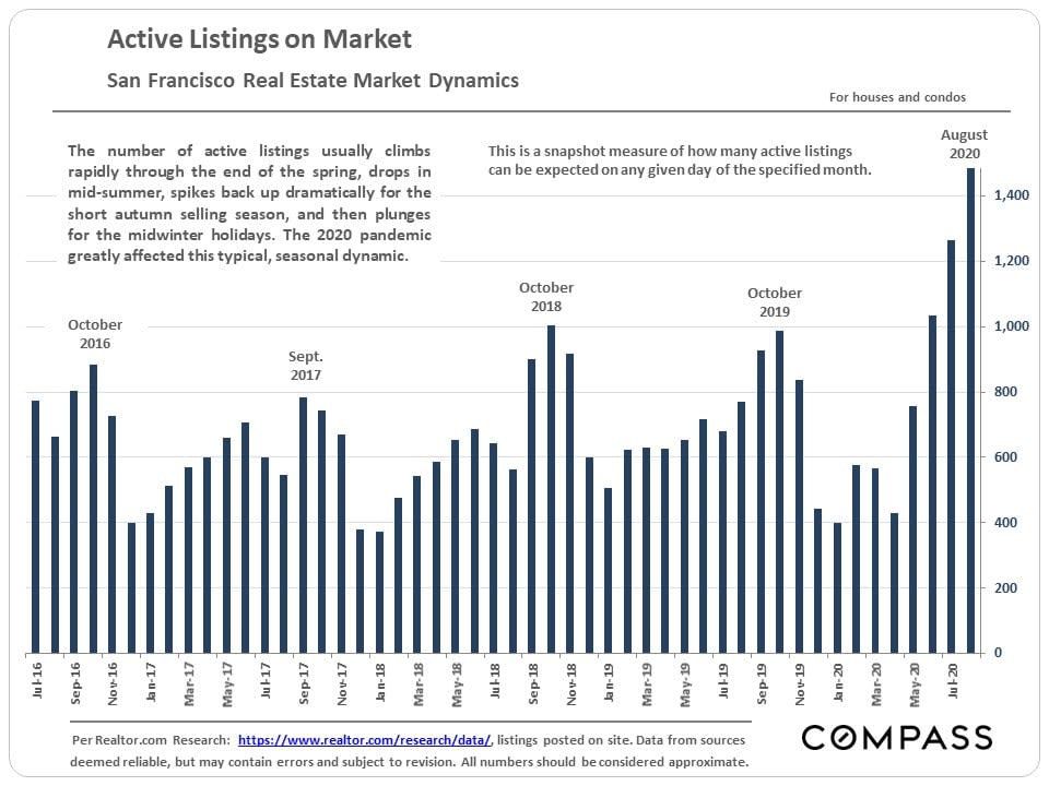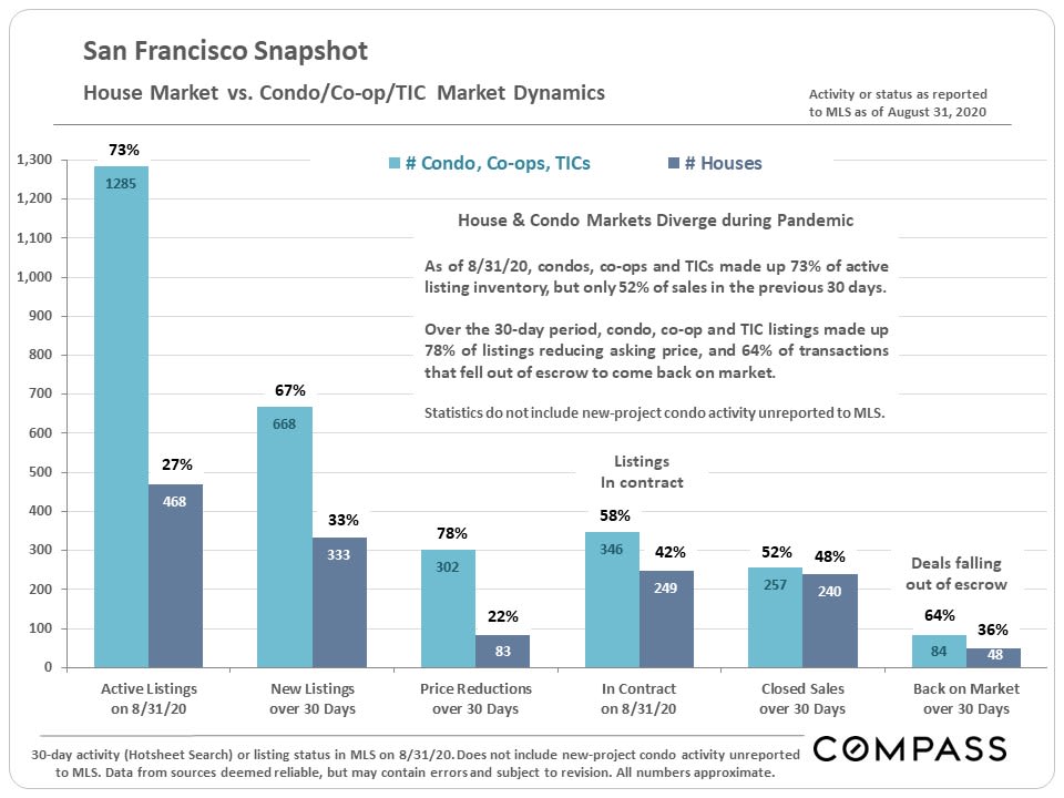 The number of active listings on the SF market has risen dramatically over the last few months, outpacing the increase in listings going into contract. However, there are significant differences between the house and condo markets, which are discussed later in the report.