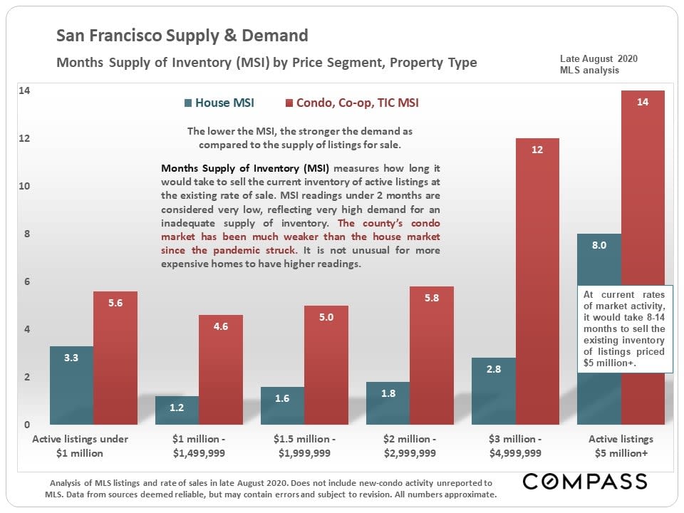 Regarding the next chart, the lower the Months Supply of Inventory (MSI), the stronger the demand as compared to the supply of listings for sale. Much of the SF house market (blue columns) remains firmly in "seller's market" territory, but the condo market's supply (red columns) is outpacing buyer demand, especially in the higher price segments.