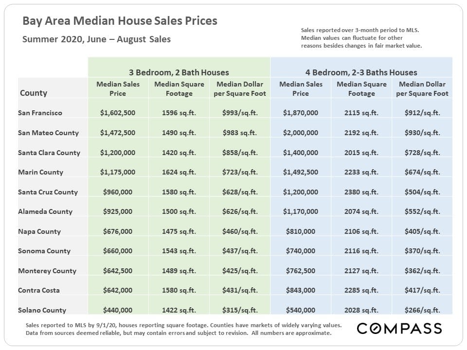 Below is a comparison of median house sales prices, sizes and dollar per square foot values around the Bay Area this past summer.