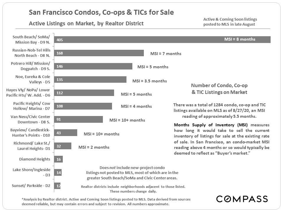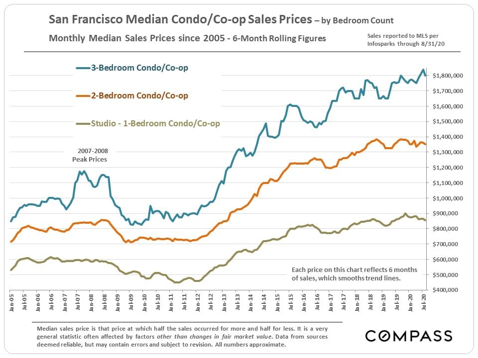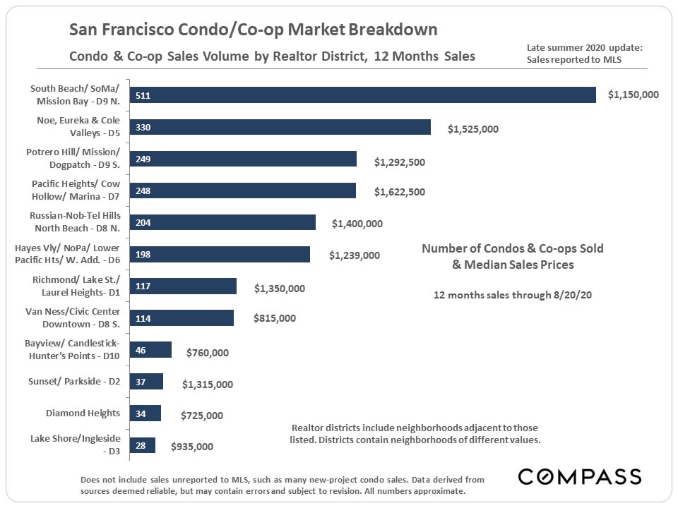 The following 3 charts illustrate aspects of the SF CONDO & CO-OP market: Median sales price trends by bedroom count; sales volumes and median sales prices by Realtor district; and the number of active listings by Realtor district with an analysis of months supply of inventory.