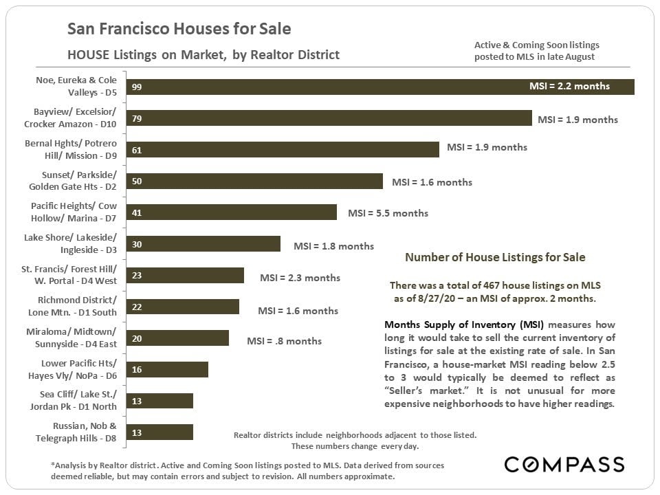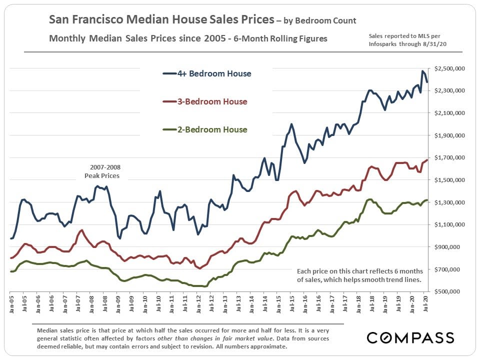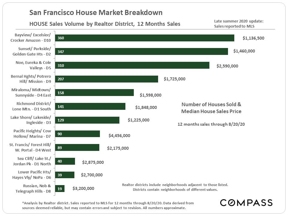 The following 3 charts illustrate aspects of the SF HOUSE market: Median house sales price trends by bedroom count; sales volumes and median sales prices by Realtor district; and the number of active house listings by Realtor district with an analysis of months supply of inventory.