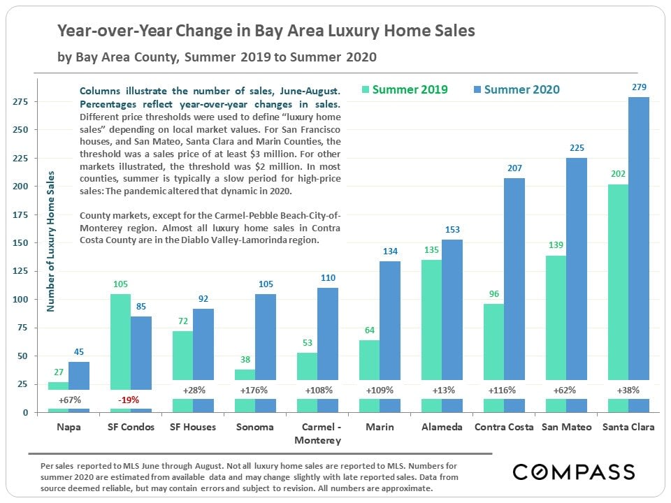 A review of year-over-year changes in the number of luxury home sales around the Bay Area this past summer. Some other counties have seen astounding increases. SF luxury house sales increased by a more modest percentage; SF luxury condo sales declined year over year.