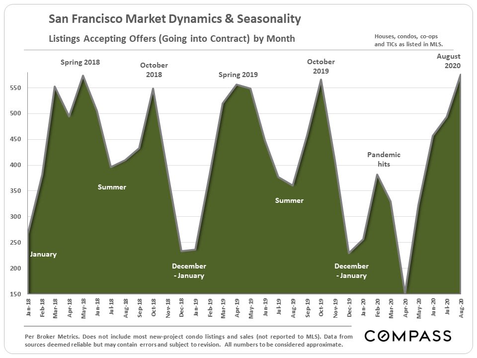 Despite the terrible fires, SF had a very active month in listings going into contract in August, hitting a high point for the year and matching the high points of recent years. Surprisingly, the fires did not significantly impact the number of deals being made in most Bay Area counties during the last 2 weeks of the month - the exceptions being Santa Cruz, Sonoma, Monterey and Napa Counties, which saw declines of 13% to 33%.