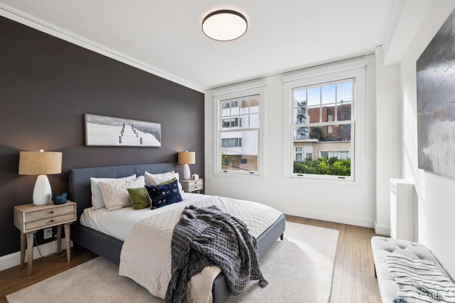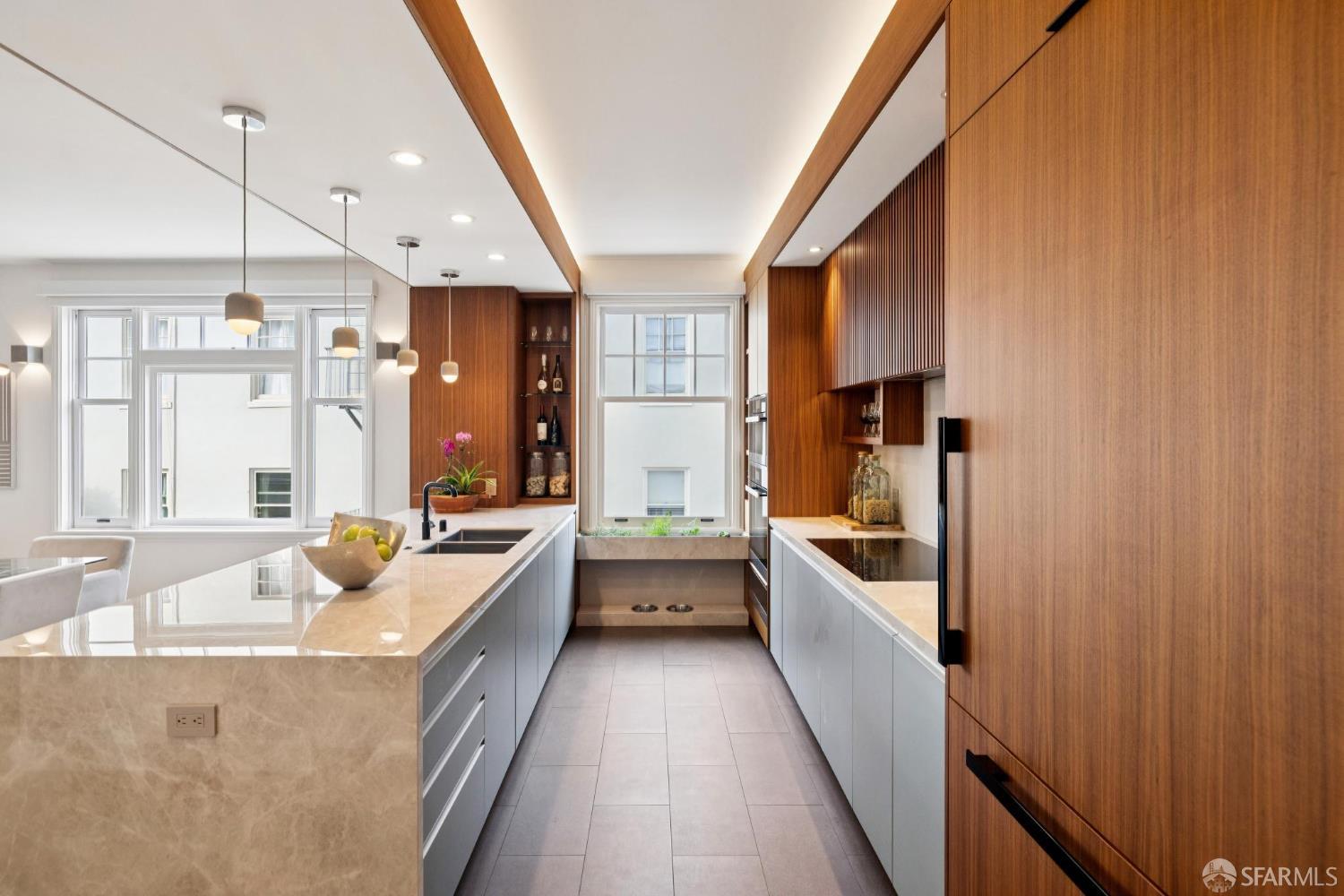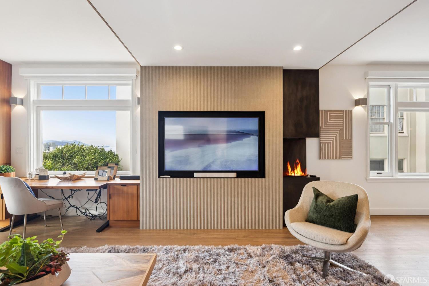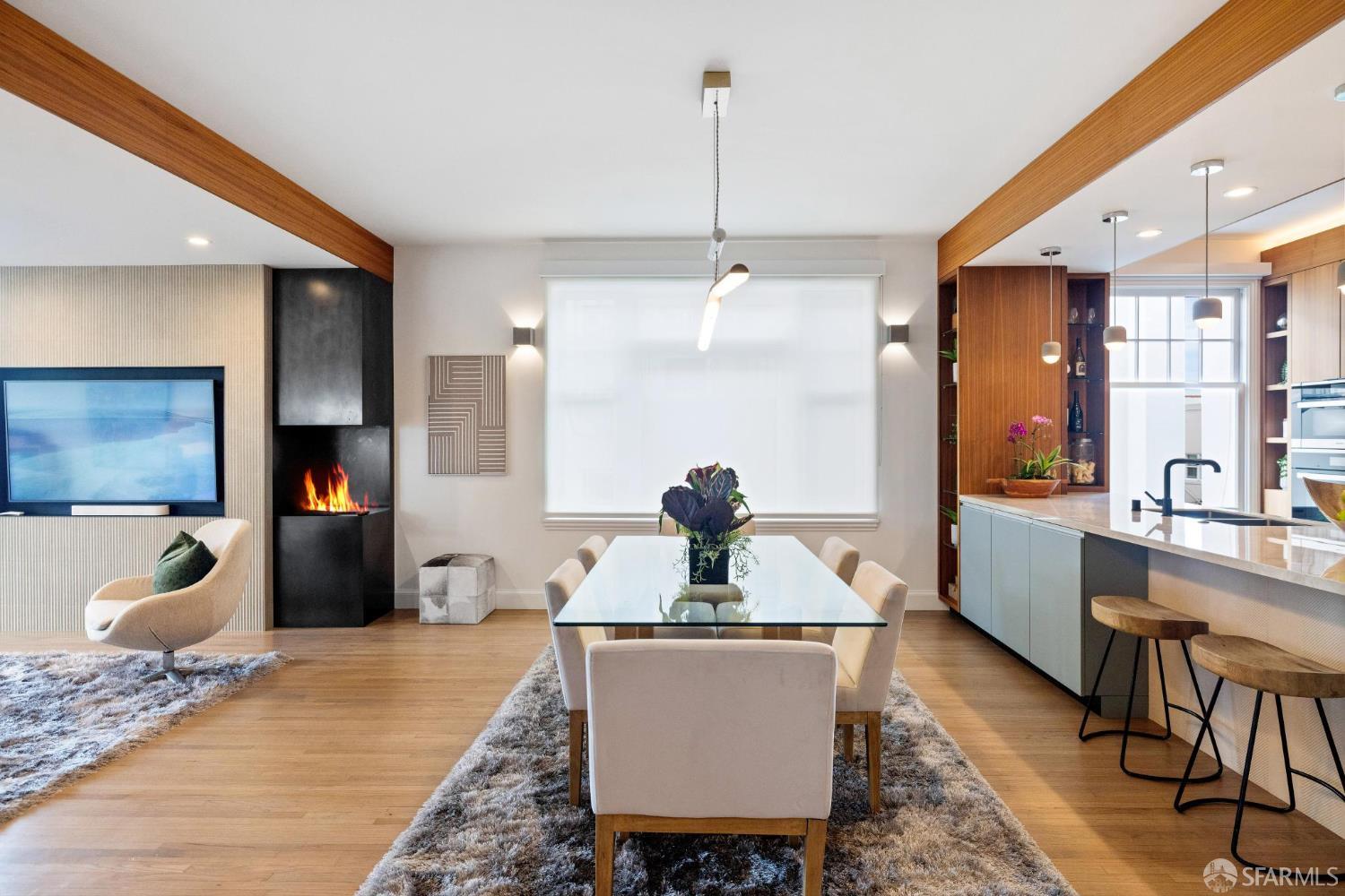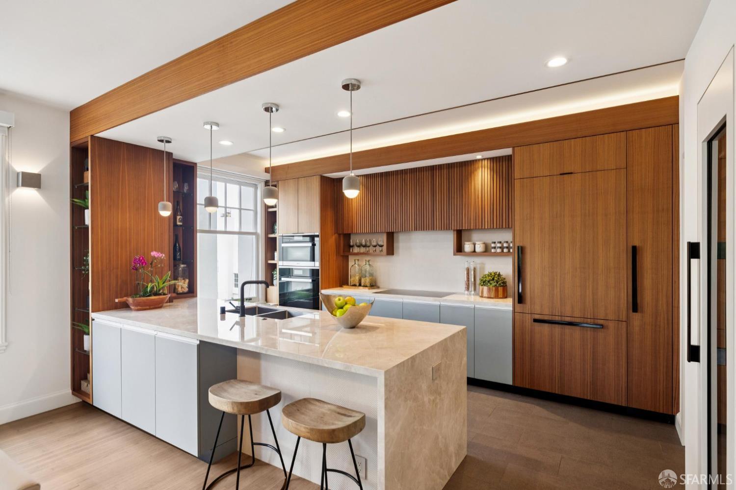 Newly-renovated & rarely-available 2-bedroom / 2-bath / 2-car parking condominium with top-of-the-line finishes & Golden Gate Bridge views is now available! Located in elegant Mediterranean-inspired Pacific Heights building with on-site manager & in-unit washer/dryer, this condo seamlessly blends old-world charm with modern conveniences! Epicurean Kitchen is both functional & beautiful, featuring large stone peninsula for casual dining or entertaining, Miele appliances, double oven, Wolf induction range, full-size temperature-controlled beverage refrigerator, walk-in pantry, abundant storage, & luxurious walnut cabinetry with accents. The spacious Living/Dining Area includes an eco-friendly fireplace that simulates flame with light & air, room for a large dining table, custom walnut built-ins with accent lighting & generous walnut uplift desk for sitting or standing. A picture window above the desk frames quintessential Golden Gate Bridge view. Two, large bedrooms & spa-like bathrooms offer retreat-style comfort. Primary Bathroom features a deep Florou soaking tub with marble, back-lit panels, heated floors, & premium finishes throughout. Custom, walk-in closets complete the condo! Common area: Posh lobby, 2 elevators, roof w/ 360-degree views of GG Bridge, Mt. Tam, Salesforce!