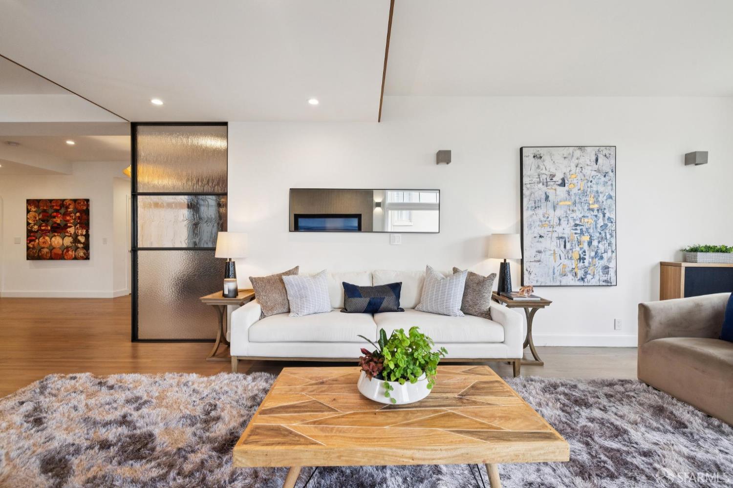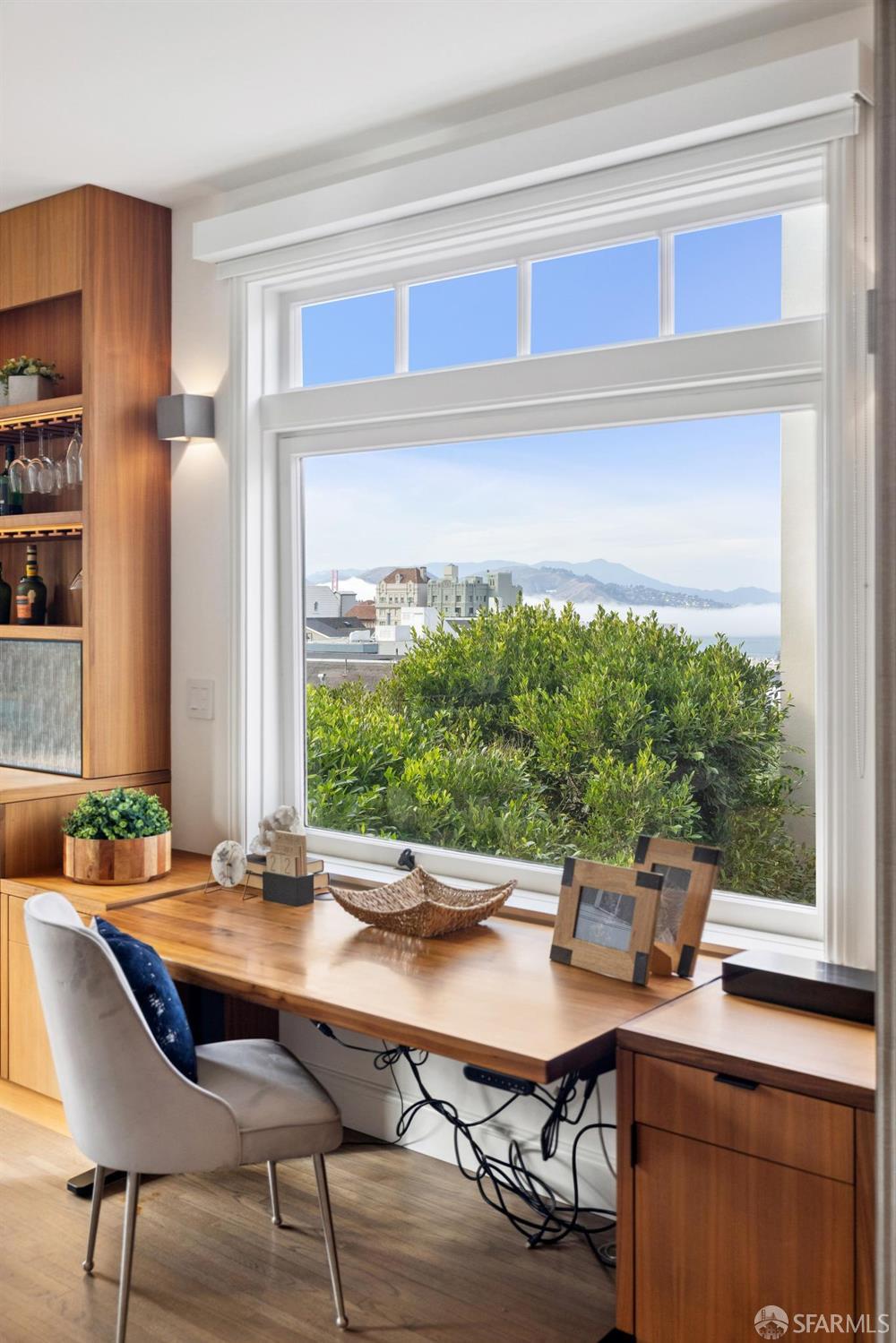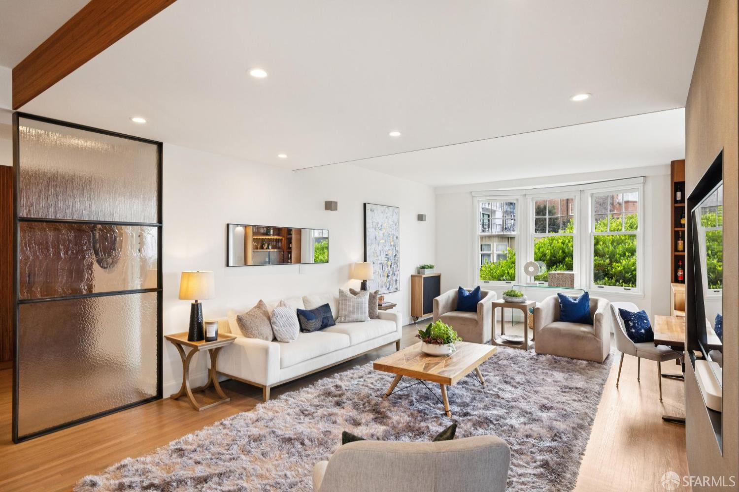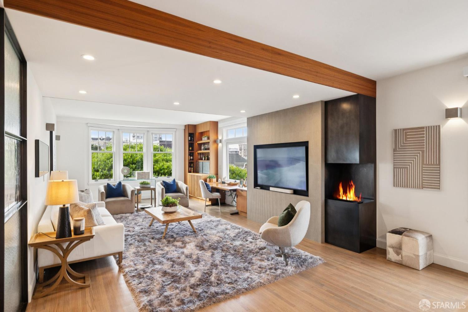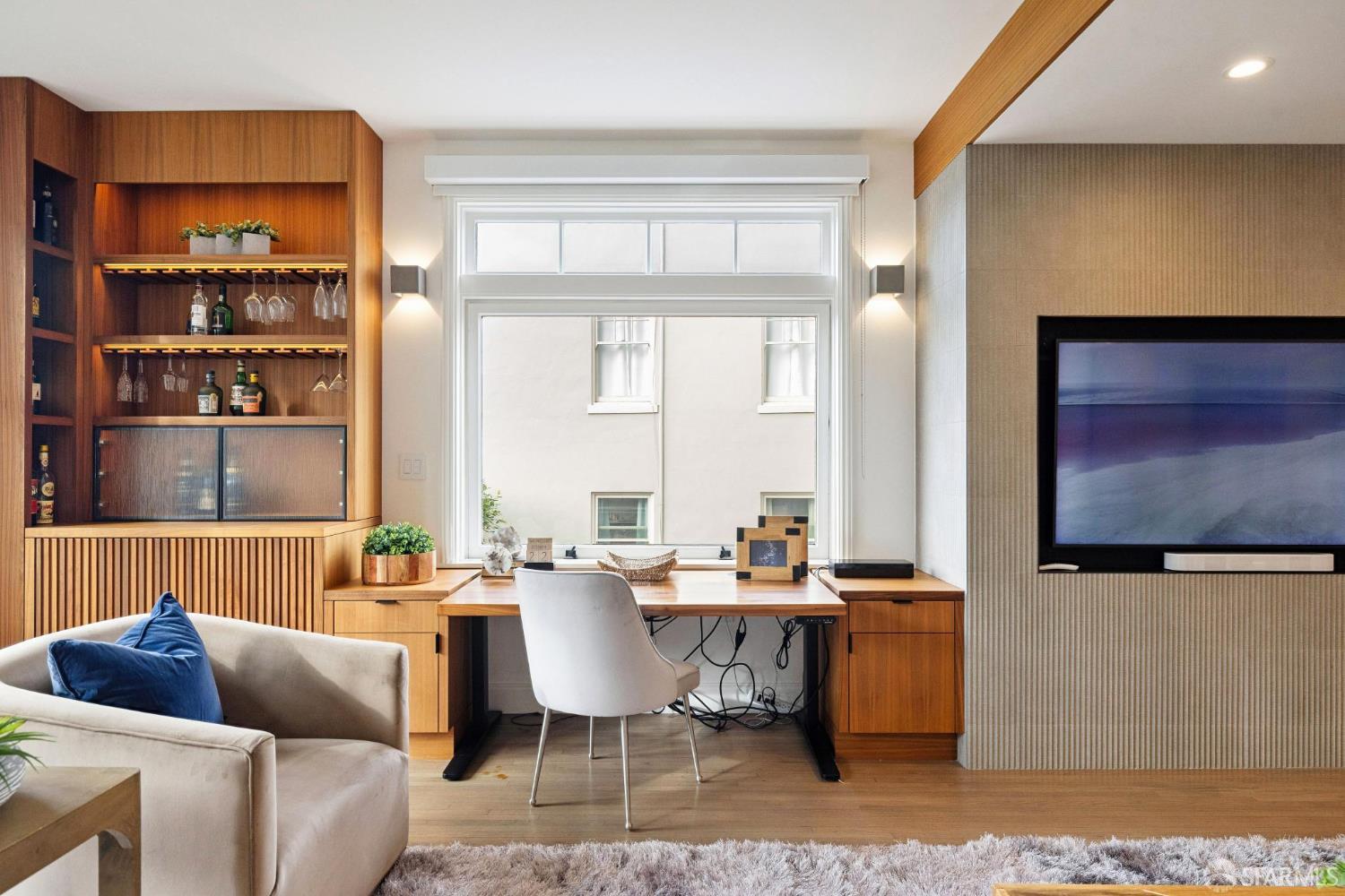 Newly-renovated & rarely-available 2-bedroom / 2-bath / 2-car parking condominium with top-of-the-line finishes & Golden Gate Bridge views is now available! Located in elegant Mediterranean-inspired Pacific Heights building with on-site manager & in-unit washer/dryer, this condo seamlessly blends old-world charm with modern conveniences! Epicurean Kitchen is both functional & beautiful, featuring large stone peninsula for casual dining or entertaining, Miele appliances, double oven, Wolf induction range, full-size temperature-controlled beverage refrigerator, walk-in pantry, abundant storage, & luxurious walnut cabinetry with accents. The spacious Living/Dining Area includes an eco-friendly fireplace that simulates flame with light & air, room for a large dining table, custom walnut built-ins with accent lighting & generous walnut uplift desk for sitting or standing. A picture window above the desk frames quintessential Golden Gate Bridge view. Two, large bedrooms & spa-like bathrooms offer retreat-style comfort. Primary Bathroom features a deep Florou soaking tub with marble, back-lit panels, heated floors, & premium finishes throughout. Custom, walk-in closets complete the condo! Common area: Posh lobby, 2 elevators, roof w/ 360-degree views of GG Bridge, Mt. Tam, Salesforce!