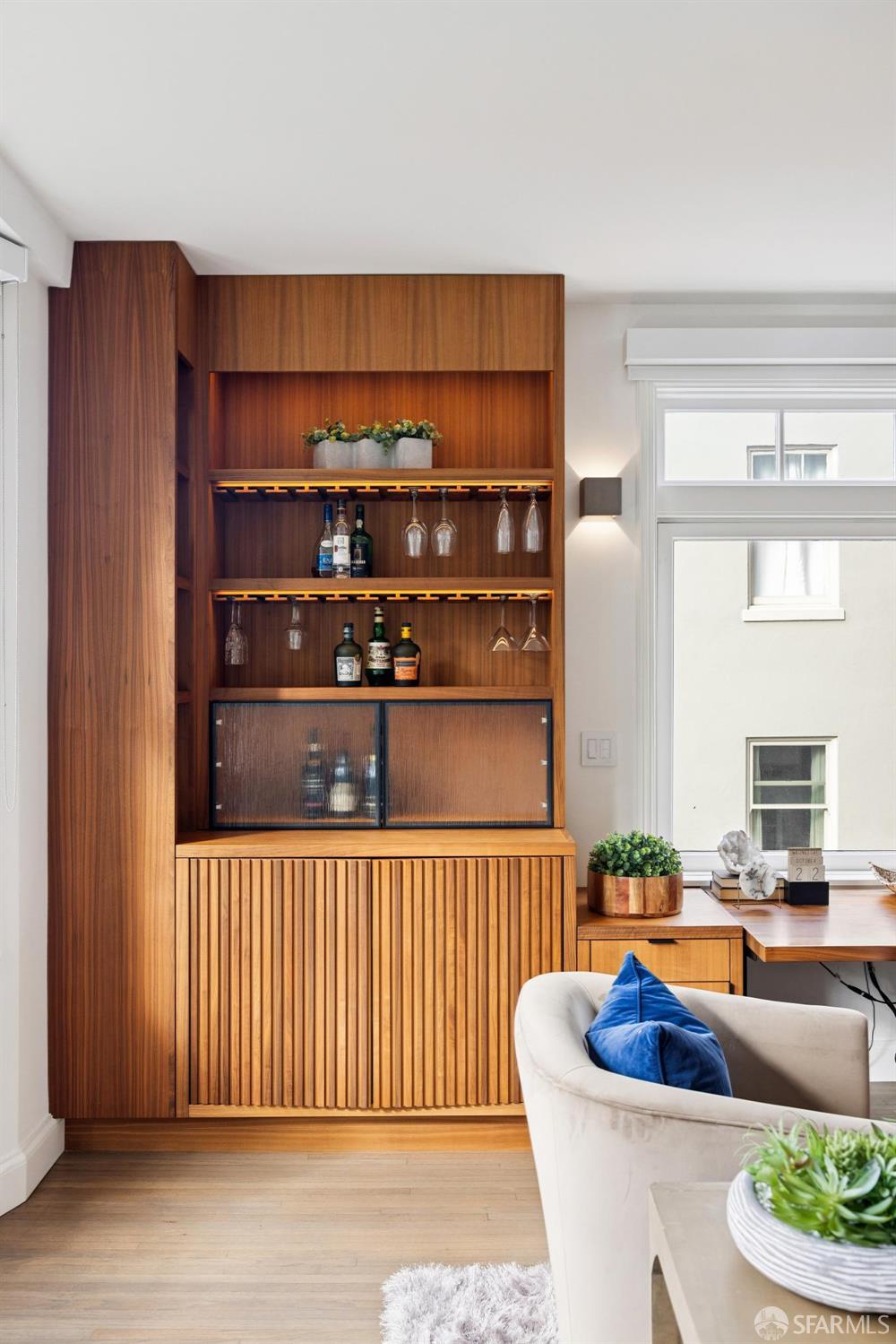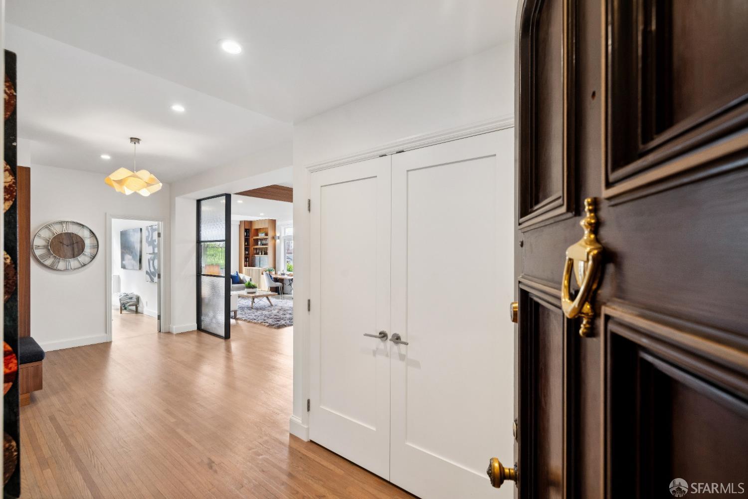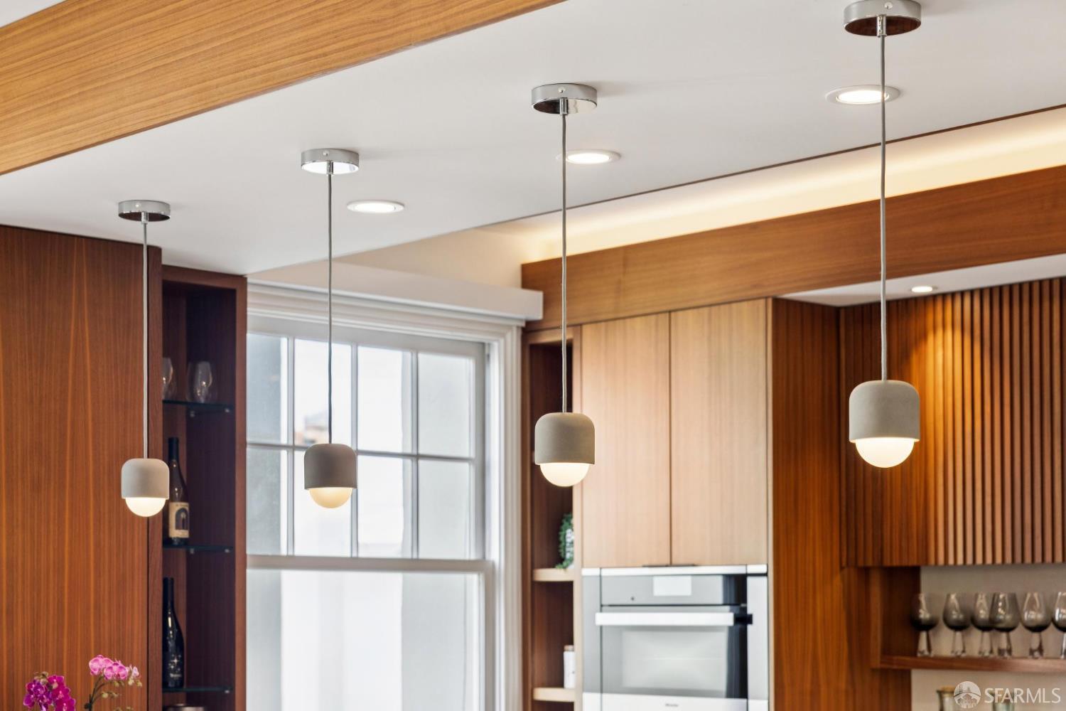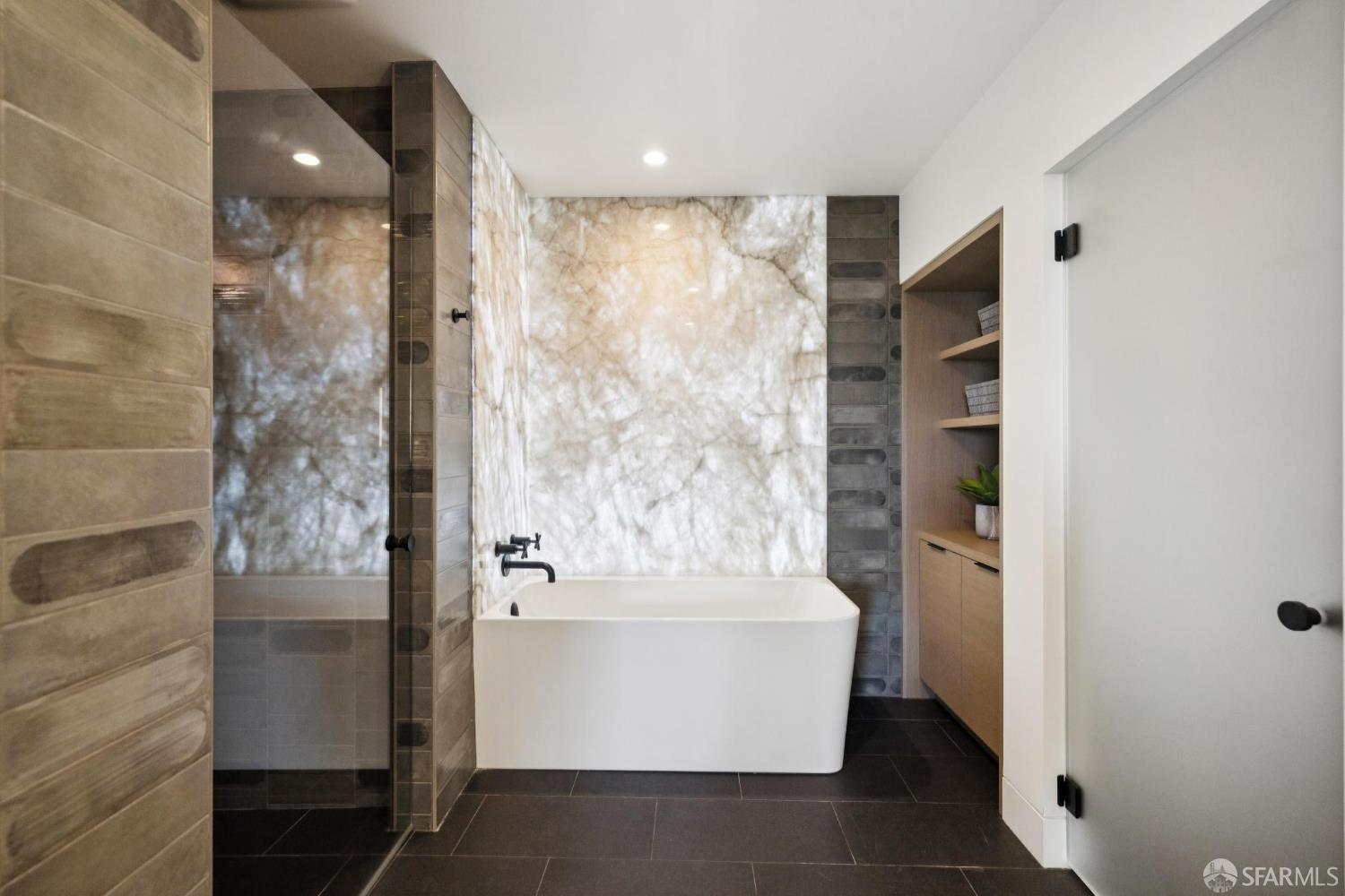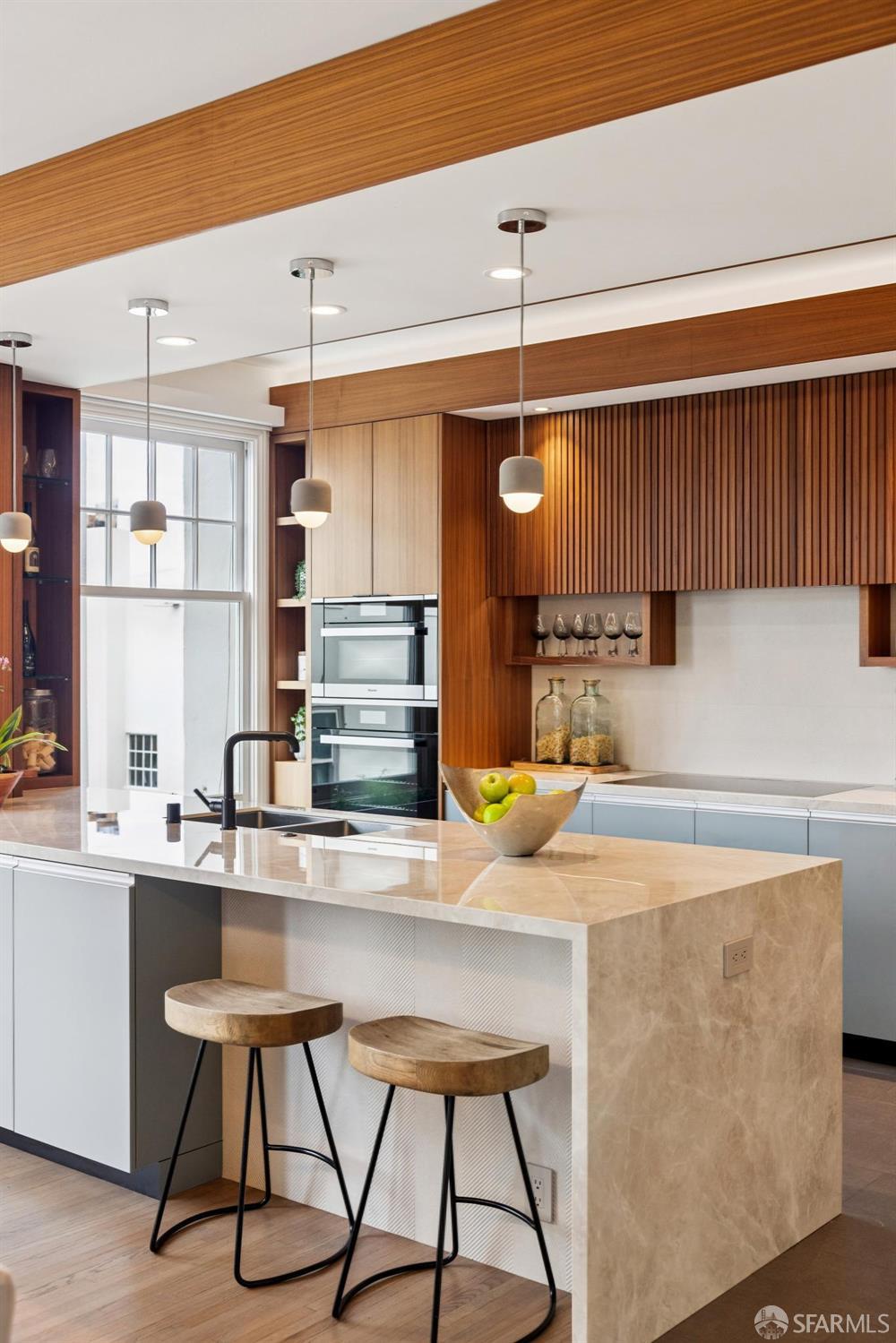 Newly-renovated & rarely-available 2-bedroom / 2-bath / 2-car parking condominium with top-of-the-line finishes & Golden Gate Bridge views is now available! Located in elegant Mediterranean-inspired Pacific Heights building with on-site manager & in-unit washer/dryer, this condo seamlessly blends old-world charm with modern conveniences! Epicurean Kitchen is both functional & beautiful, featuring large stone peninsula for casual dining or entertaining, Miele appliances, double oven, Wolf induction range, full-size temperature-controlled beverage refrigerator, walk-in pantry, abundant storage, & luxurious walnut cabinetry with accents. The spacious Living/Dining Area includes an eco-friendly fireplace that simulates flame with light & air, room for a large dining table, custom walnut built-ins with accent lighting & generous walnut uplift desk for sitting or standing. A picture window above the desk frames quintessential Golden Gate Bridge view. Two, large bedrooms & spa-like bathrooms offer retreat-style comfort. Primary Bathroom features a deep Florou soaking tub with marble, back-lit panels, heated floors, & premium finishes throughout. Custom, walk-in closets complete the condo! Common area: Posh lobby, 2 elevators, roof w/ 360-degree views of GG Bridge, Mt. Tam, Salesforce!