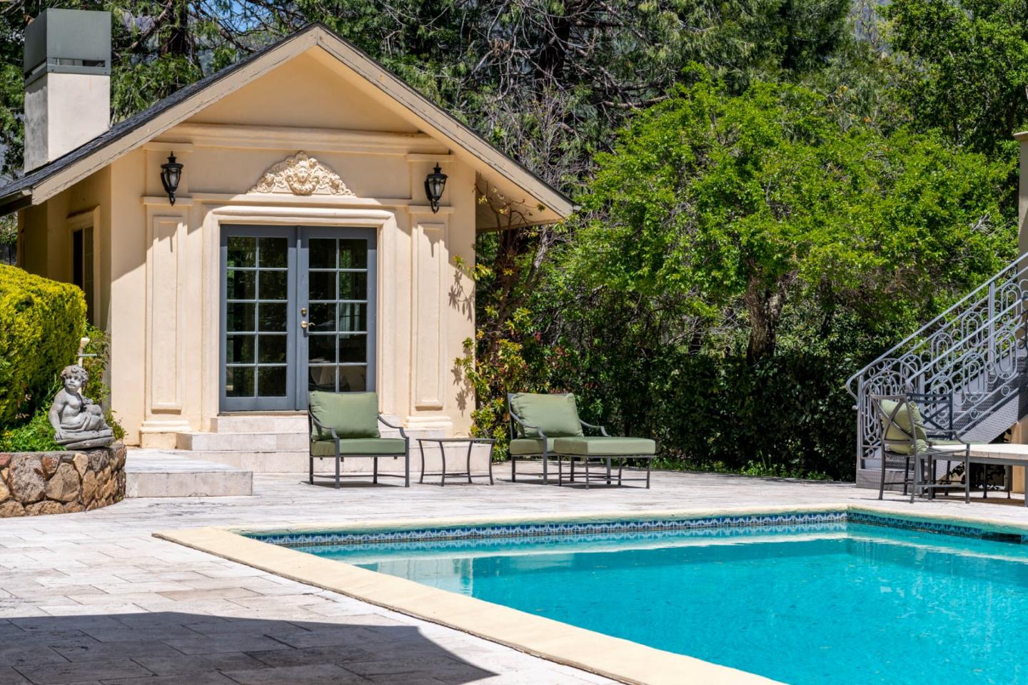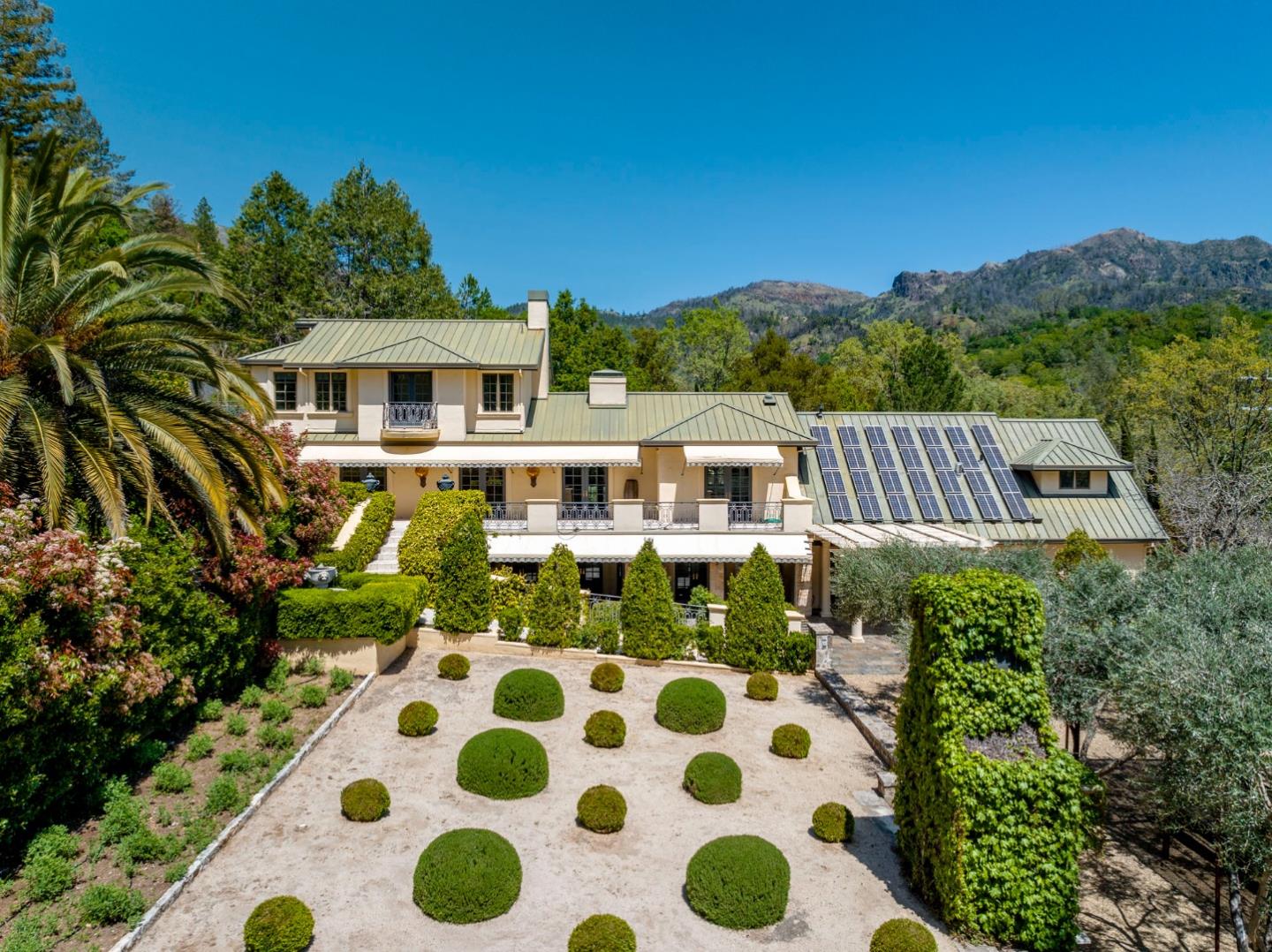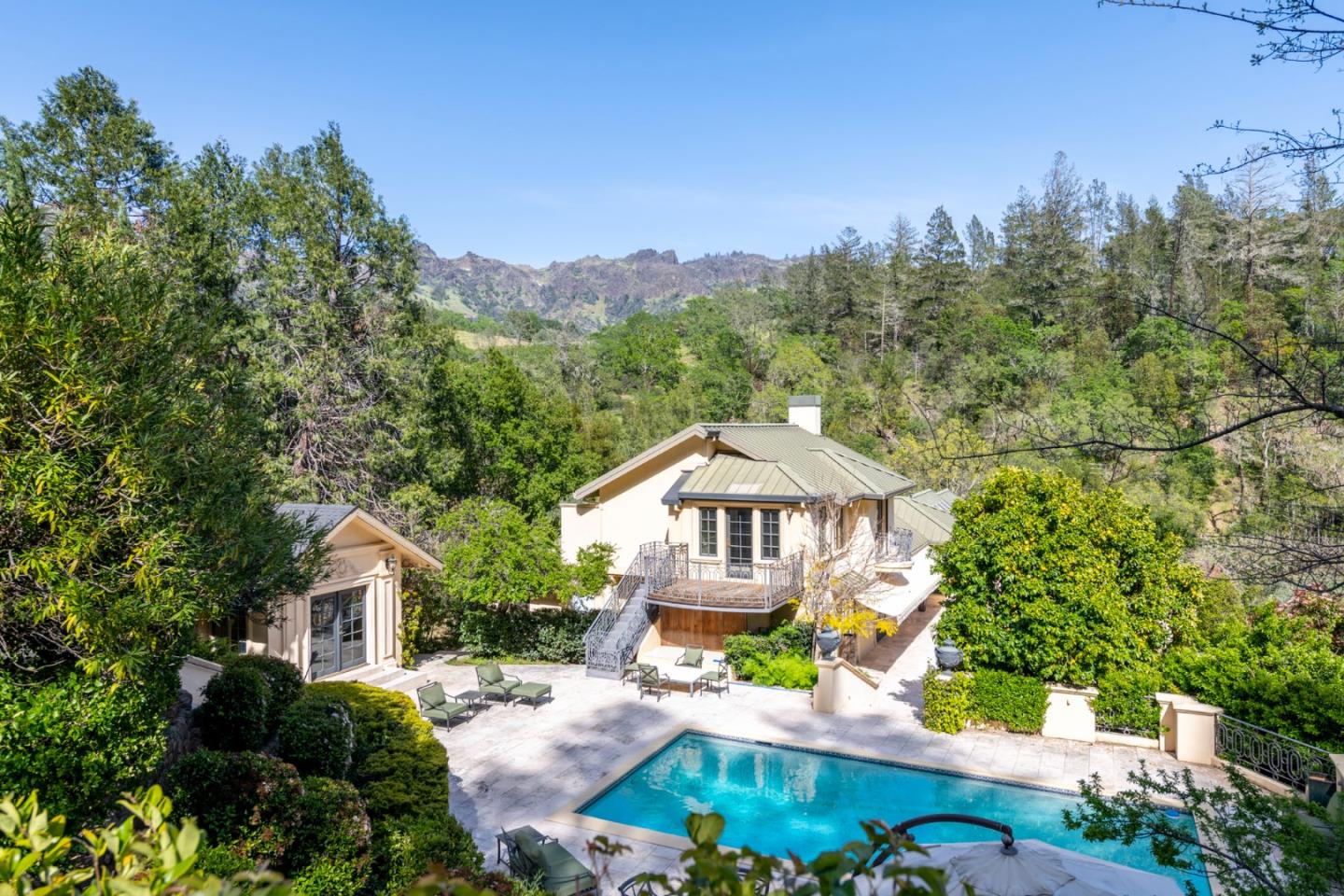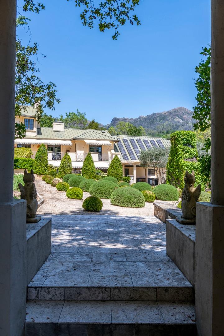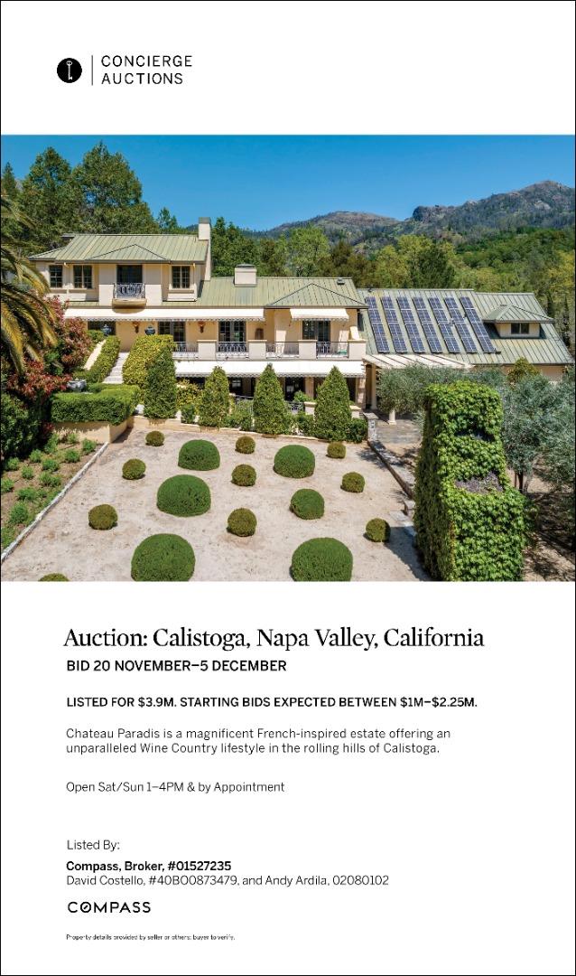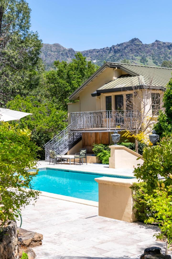AUCTION BIDDING OPEN! Bidding ends Thursday, December 5th. Previously Listed $3,900,000. Current High Bid $2,000,000. Showings are by Appointment Saturday and Sunday 1pm - 4pm. Chateau Paradis is a magnificent French-inspired estate offering an unparalleled Wine Country lifestyle in the rolling hills of Calistoga. Settled on over four acres of lush, meticulously landscaped gardens, this secure retreat offers both privacy and grandeur. Built in 1994 and extensively renovated in 2015, the property boasts 5,379 square feet of combined living space, including a 4 bedroom/5 bathroom main residence with a caterers kitchen, a pool house,guest house, and a yoga studio. The primary residence radiates European elegance with exquisite Italian crystal chandeliers, limestone and oak hardwood floors, and a chef's kitchen with an upscale La Cornue gas range. The estate is designed for effortless year-round entertaining, featuring an outdoor kitchen with an oversized outdoor dining table in the heart of the garden, great for family gatherings and weddings. The guest house, which is situated at the top of the property, provides stunning views of the Palisades Mountains from the adjacent terrace. A true legacy property, Chateau Paradis offers the ultimate in refined Napa Valley living.