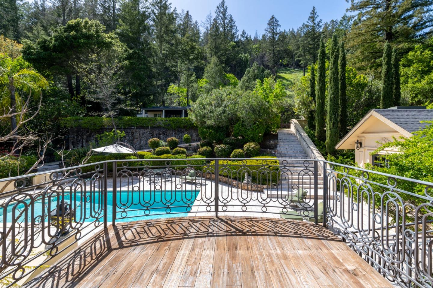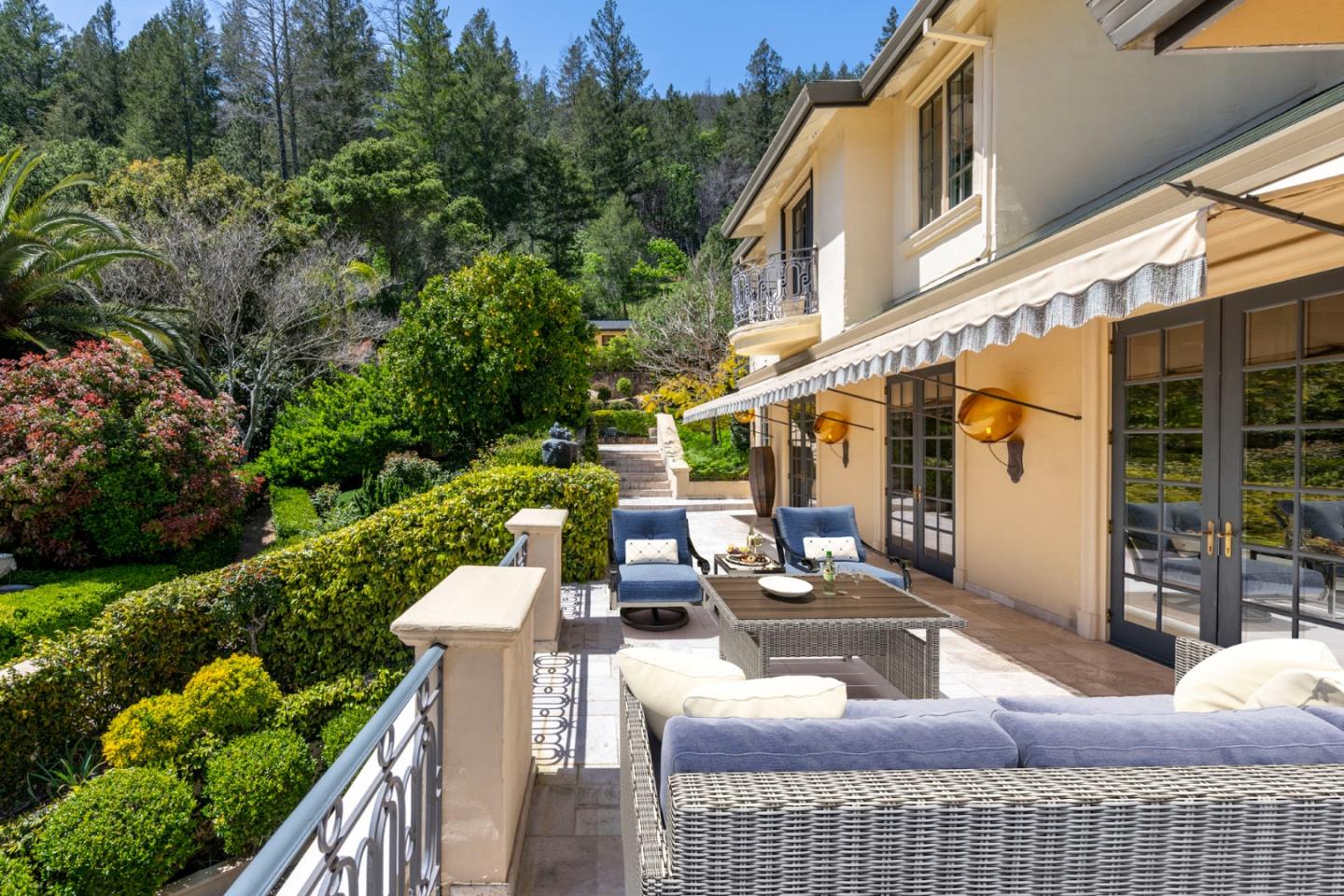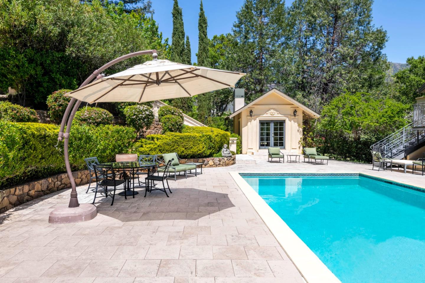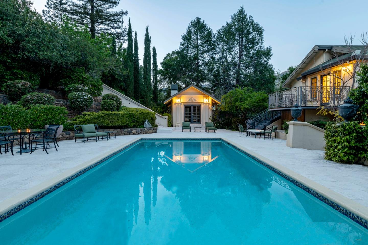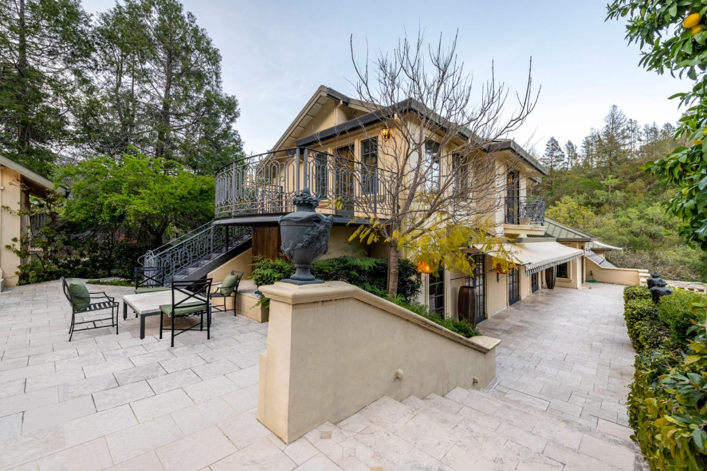 AUCTION BIDDING OPEN! Bidding ends Thursday, December 5th. Previously Listed $3,900,000. Current High Bid $2,000,000. Showings are by Appointment Saturday and Sunday 1pm - 4pm. Chateau Paradis is a magnificent French-inspired estate offering an unparalleled Wine Country lifestyle in the rolling hills of Calistoga. Settled on over four acres of lush, meticulously landscaped gardens, this secure retreat offers both privacy and grandeur. Built in 1994 and extensively renovated in 2015, the property boasts 5,379 square feet of combined living space, including a 4 bedroom/5 bathroom main residence with a caterers kitchen, a pool house,guest house, and a yoga studio. The primary residence radiates European elegance with exquisite Italian crystal chandeliers, limestone and oak hardwood floors, and a chef's kitchen with an upscale La Cornue gas range. The estate is designed for effortless year-round entertaining, featuring an outdoor kitchen with an oversized outdoor dining table in the heart of the garden, great for family gatherings and weddings. The guest house, which is situated at the top of the property, provides stunning views of the Palisades Mountains from the adjacent terrace. A true legacy property, Chateau Paradis offers the ultimate in refined Napa Valley living.