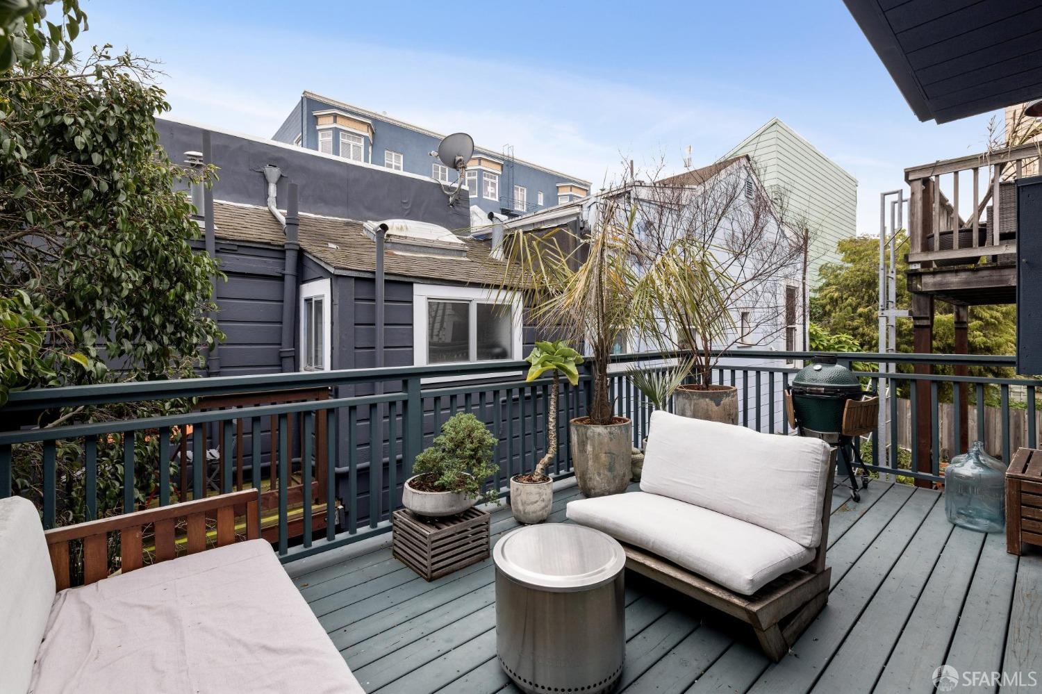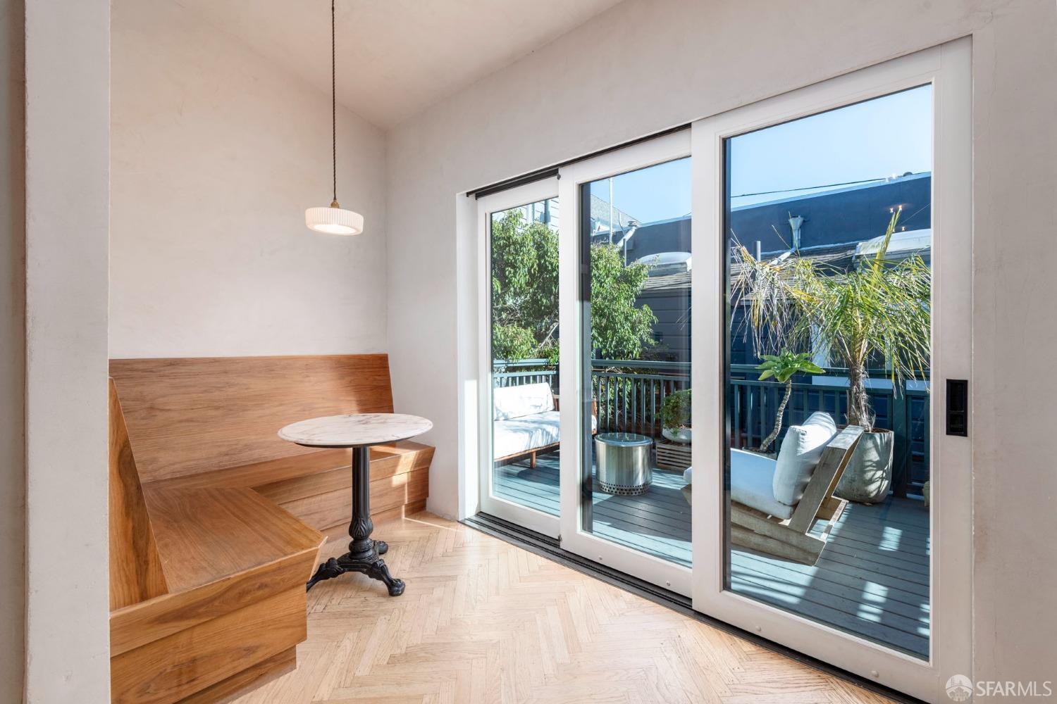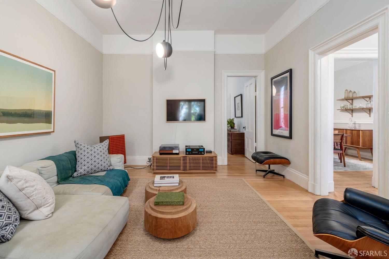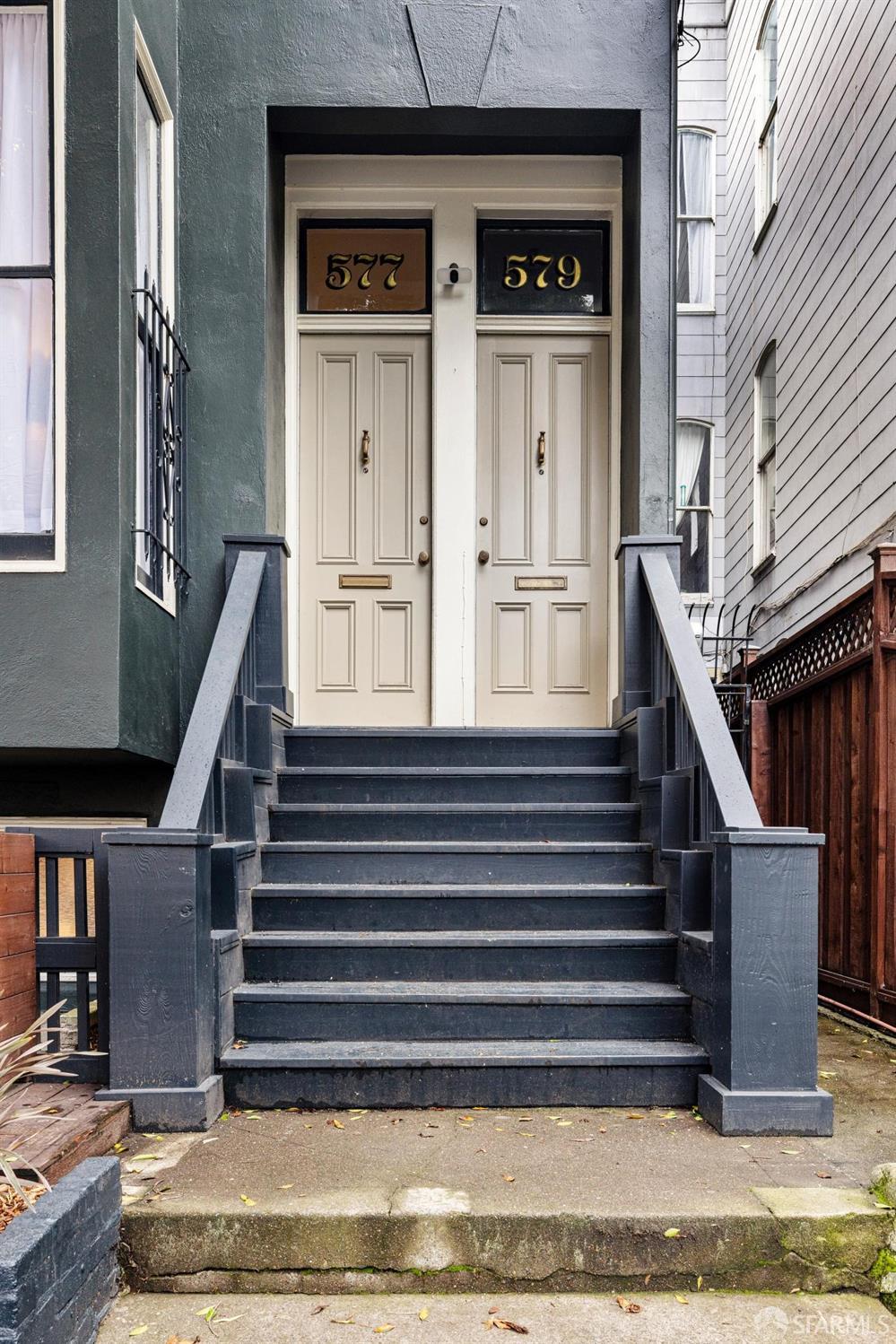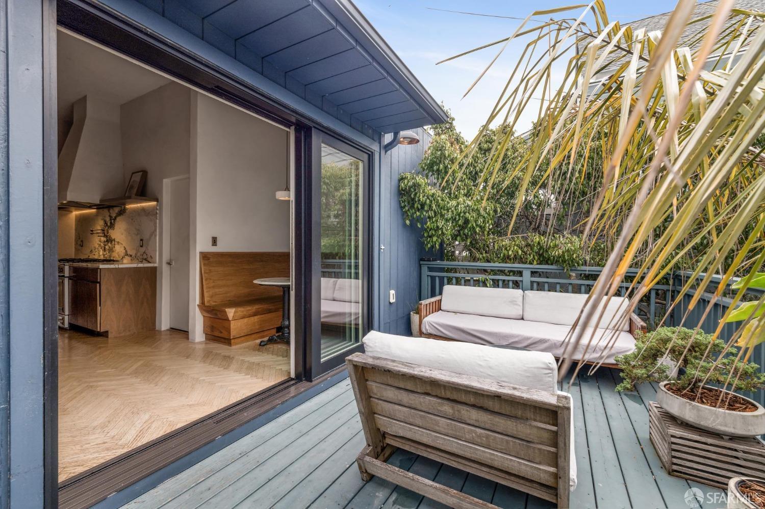 Step into the world of Victorian charm and contemporary luxury at 579 Fell Street. Nestled in the vibrant heart of Hayes Valley, this top floor condo has been meticulously renovated to the tune of over $350,000 by a renowned celebrity designer. This 1,389 sq ft home boasts 3 bedrooms, 1 bath, and 12-ft ceilings, creating a spacious and inviting atmosphere. The living space features custom built-in furniture, herringbone hardwood floors, and vintage Murano chandeliers, while the remodeled gourmet kitchen is a culinary paradise with top-of-the-line appliances, Italian marble countertops, and a custom walnut kitchen nook. Step outside onto the large private deck through high-end folding sliding doors, creating a seamless indoor/outdoor experience. The master bedroom offers a tranquil escape with a large custom closet, while the oversized bathroom exudes luxury with Venetian Plaster walls, a travertine wrapped sink and soaking tub, and a walk-in shower. Additionally, the property includes 1 leased parking space for added convenience. Transparent pricing!